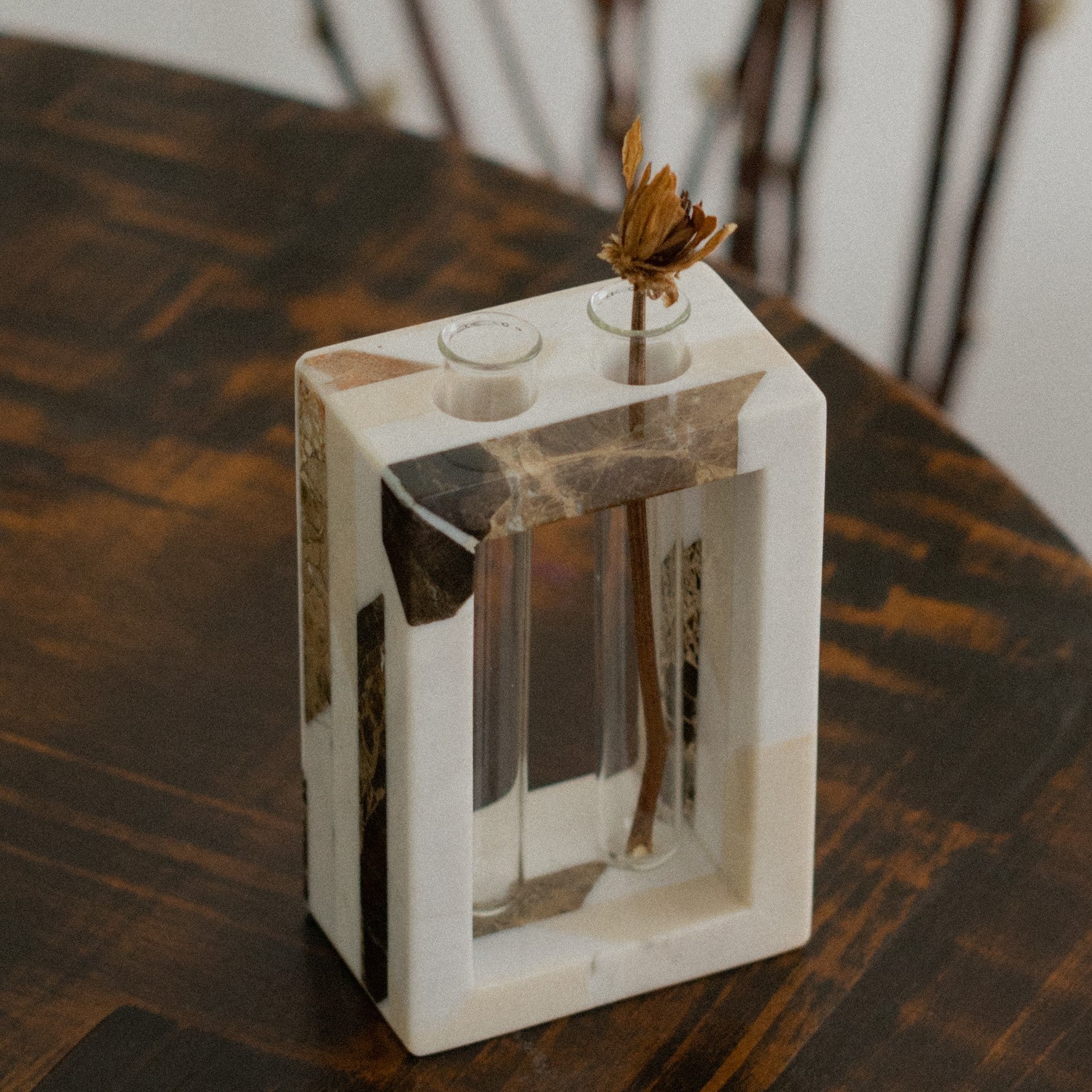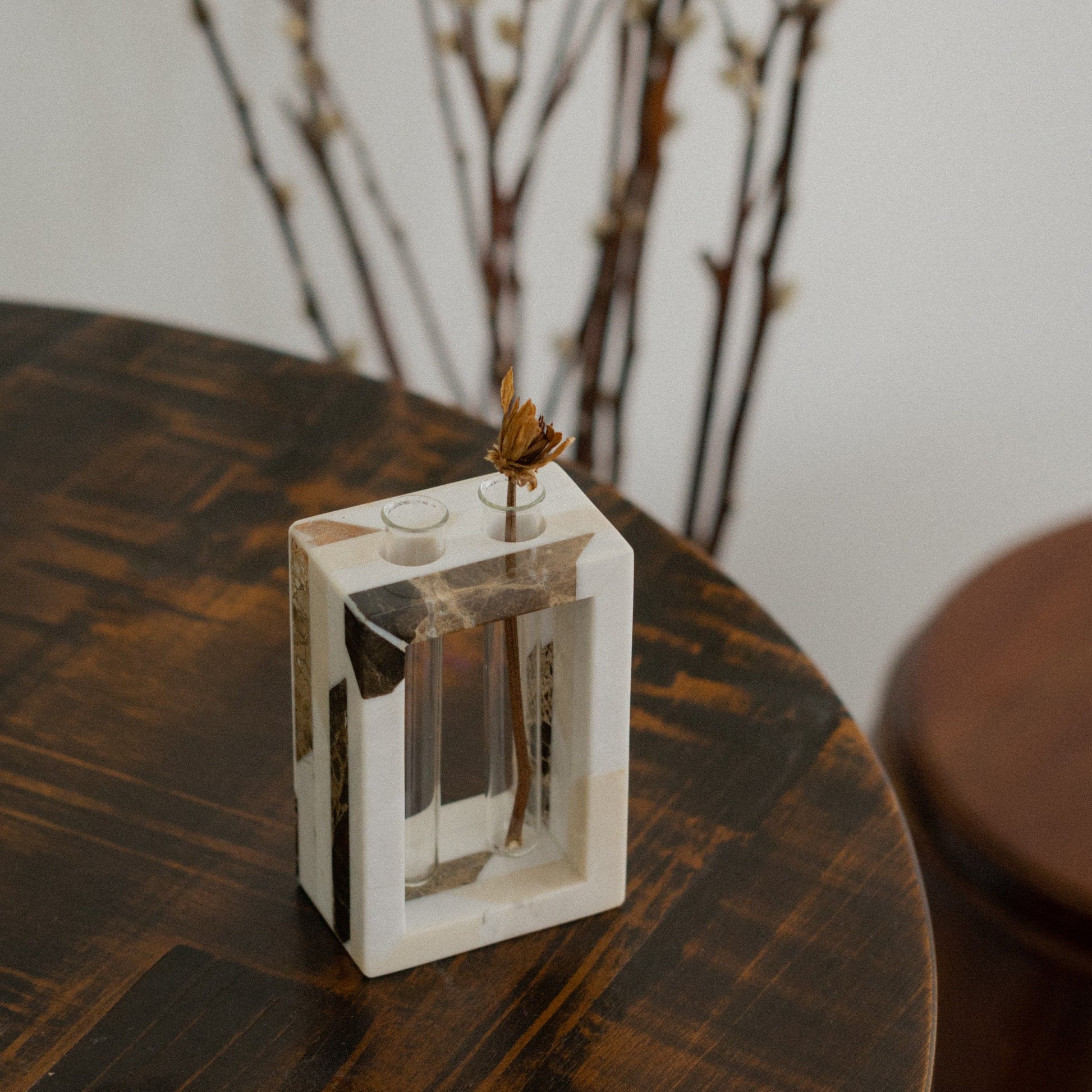 If you prefer to more simple and buy flowers in small amount, you can use our A Due Buche Vase to decorate your house. You can put different kind of flowers (dried/fresh) in each tube. This one comes with 2 tubes.