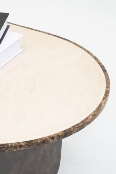 The Elvano Console Table embodies refined minimalism. Its elongated oval top, crafted from contrasting marble, rests on bold vertical panels, creating a balanced interplay of form and function.