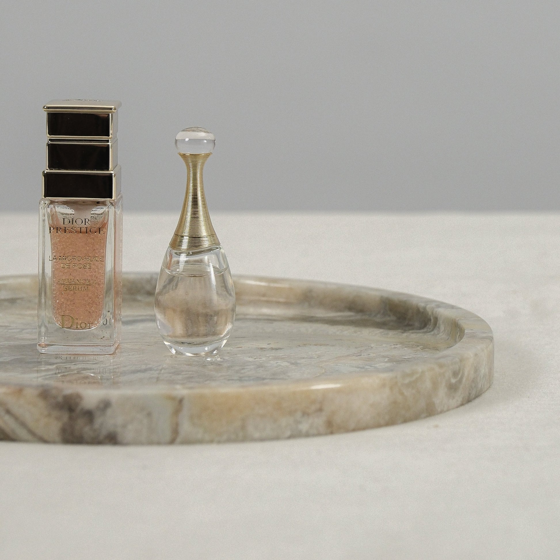 This Boundless Round Tray is meticulously crafted from high-quality onyx, showcasing its natural beauty with captivating marble veining.