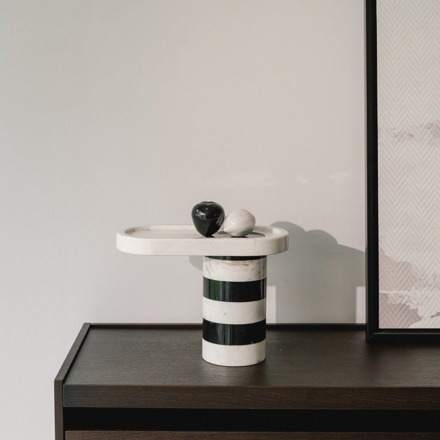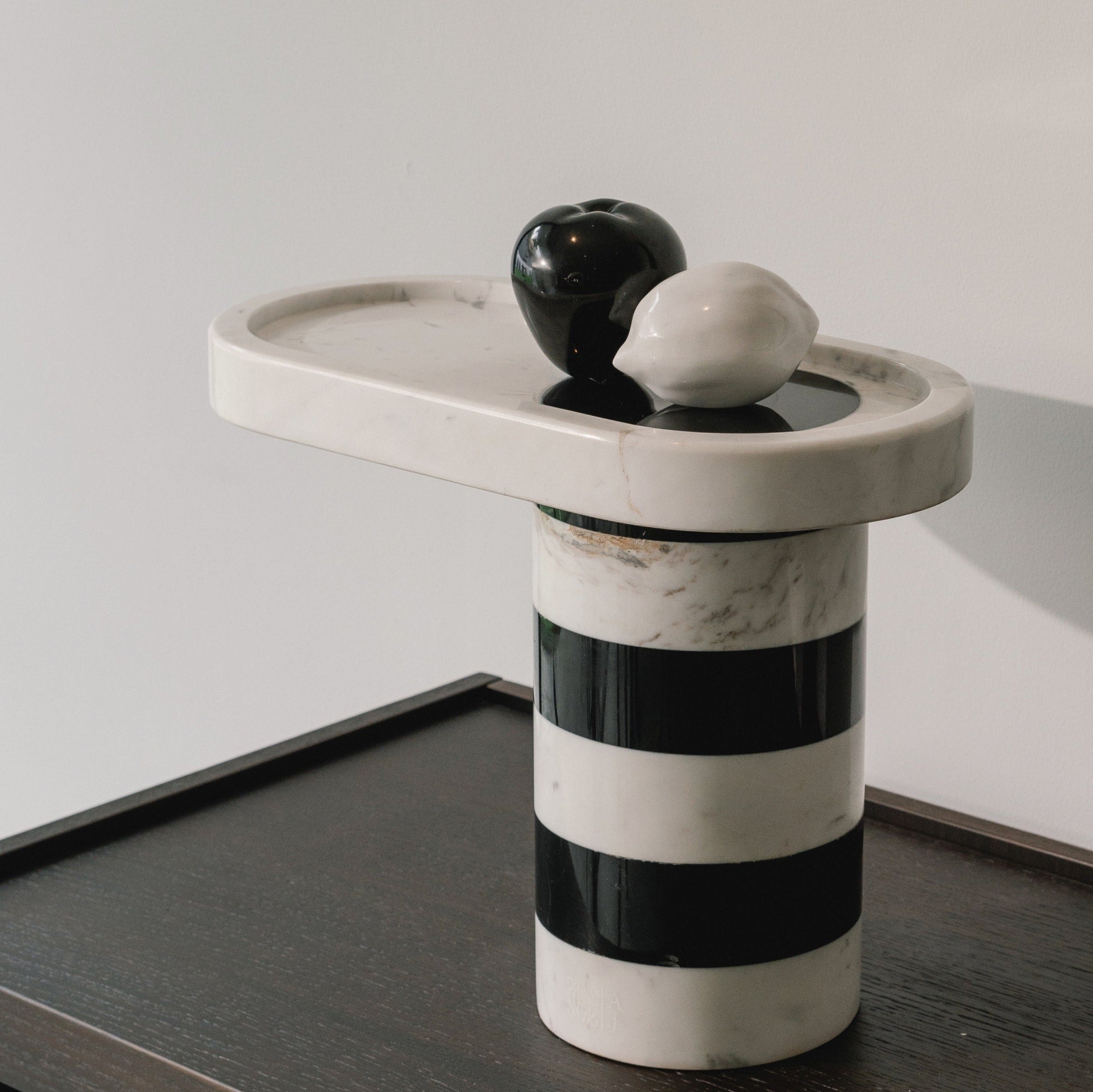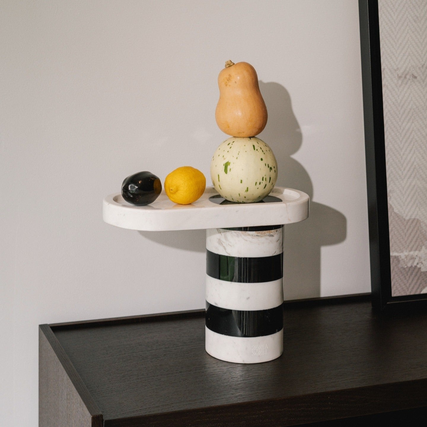 Inspired by a sturdy tube that can withstand enormous loads. The Fruity Twister has a base that can firmly hold an oval-shaped tray filled with fruit. With a touch of twister hues in Royal Black and White Valencia, it can fit into any type of interior design concept. It looks great in any space, from formal dining rooms to contemporary kitchen countertops.