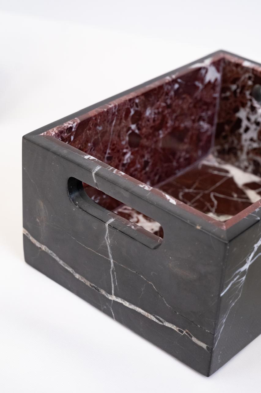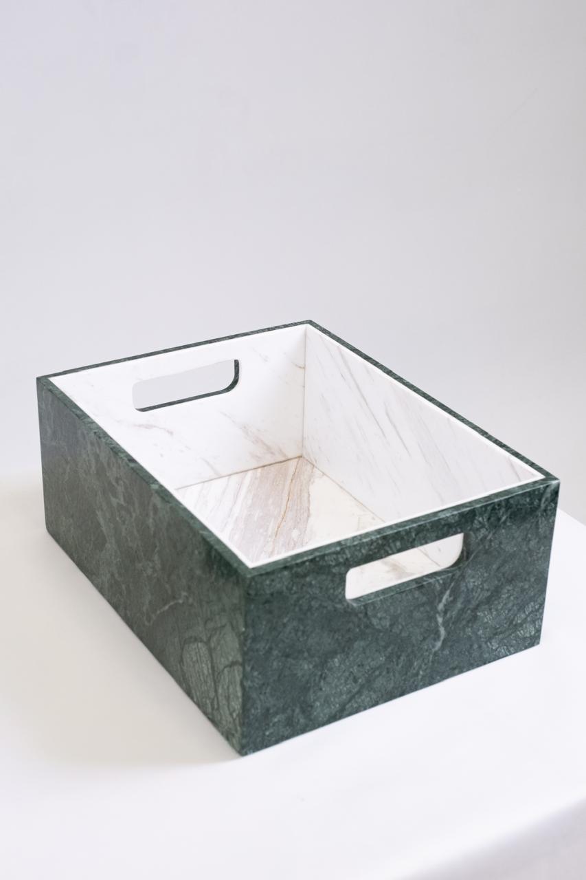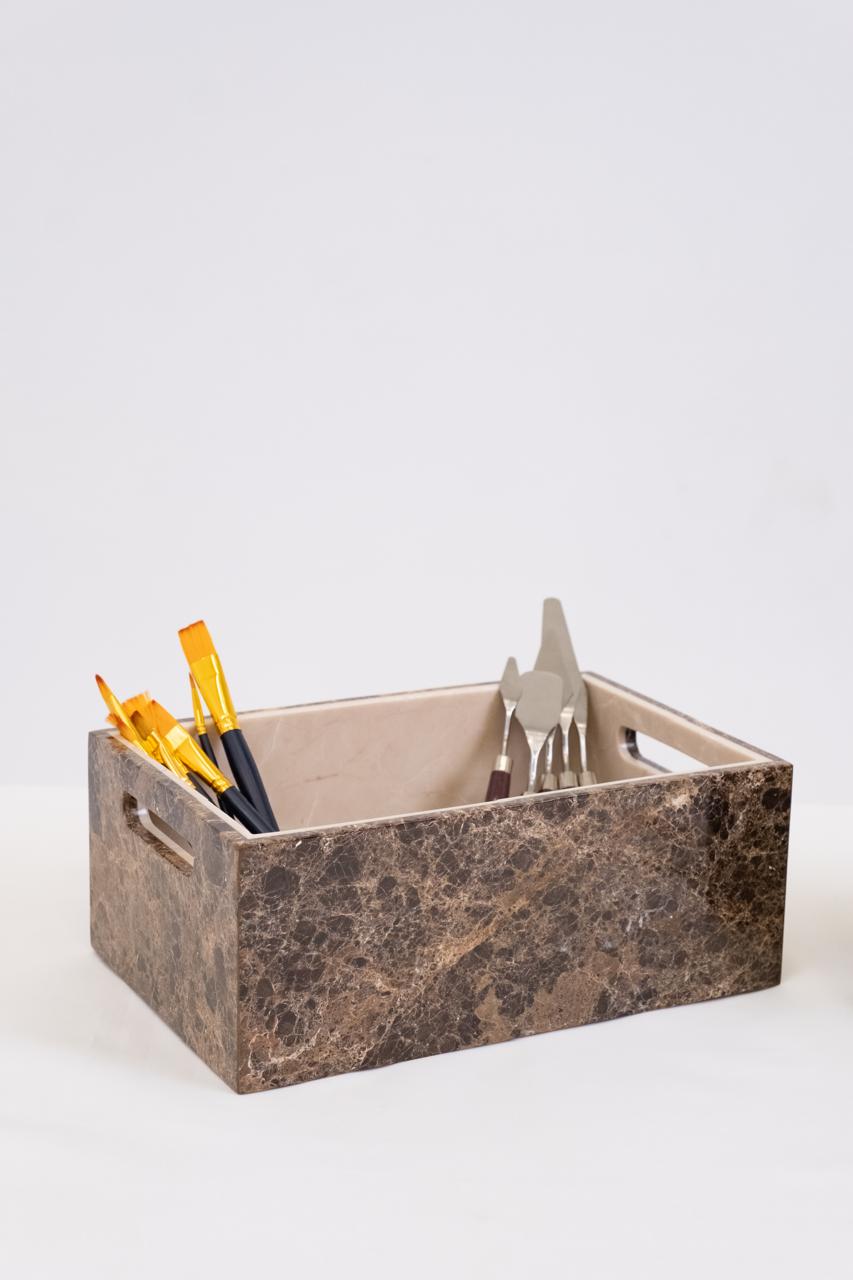 Marble Cache Storage - Palette Collection turns organization into art. Available in multiple sizes, it’s sculpted from contrasting marble tones and features integrated side handles for easy movement. Its open-top design holds towels, magazines, or accessories, while its presence elevates any space.