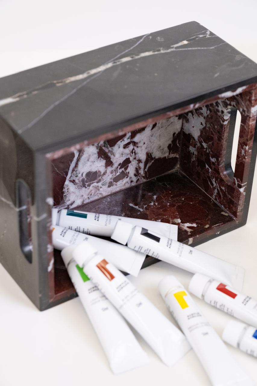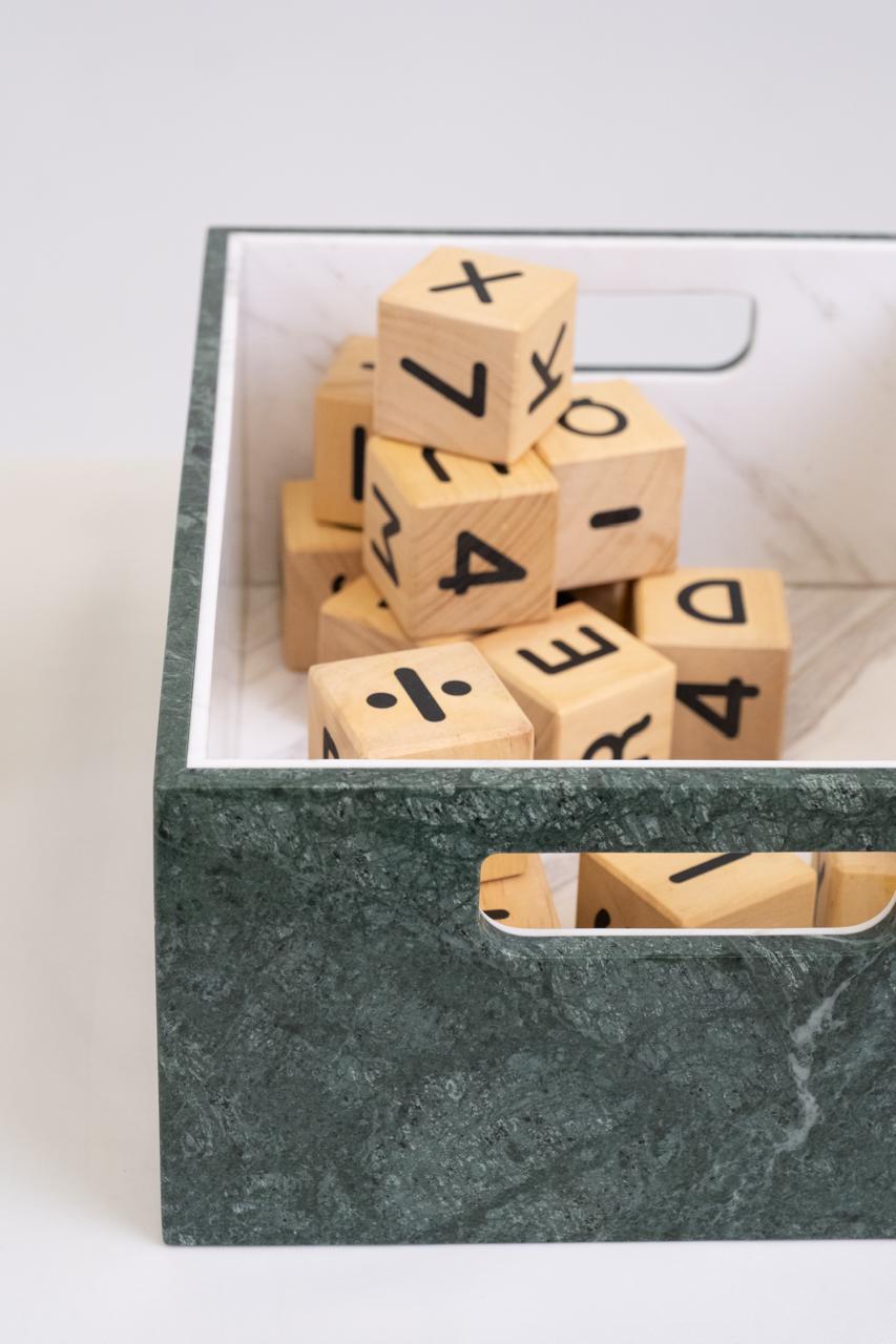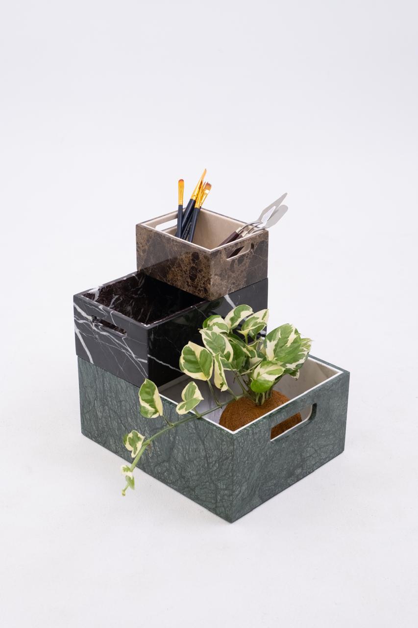 Marble Cache Storage - Palette Collection turns organization into art. Available in multiple sizes, it’s sculpted from contrasting marble tones and features integrated side handles for easy movement. Its open-top design holds towels, magazines, or accessories, while its presence elevates any space.