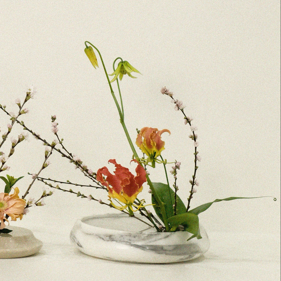 Carved from solid marble, Rooted offers a grounded presence. Its weight and form anchor each arrangement, designed to adapt to different spaces and needs.