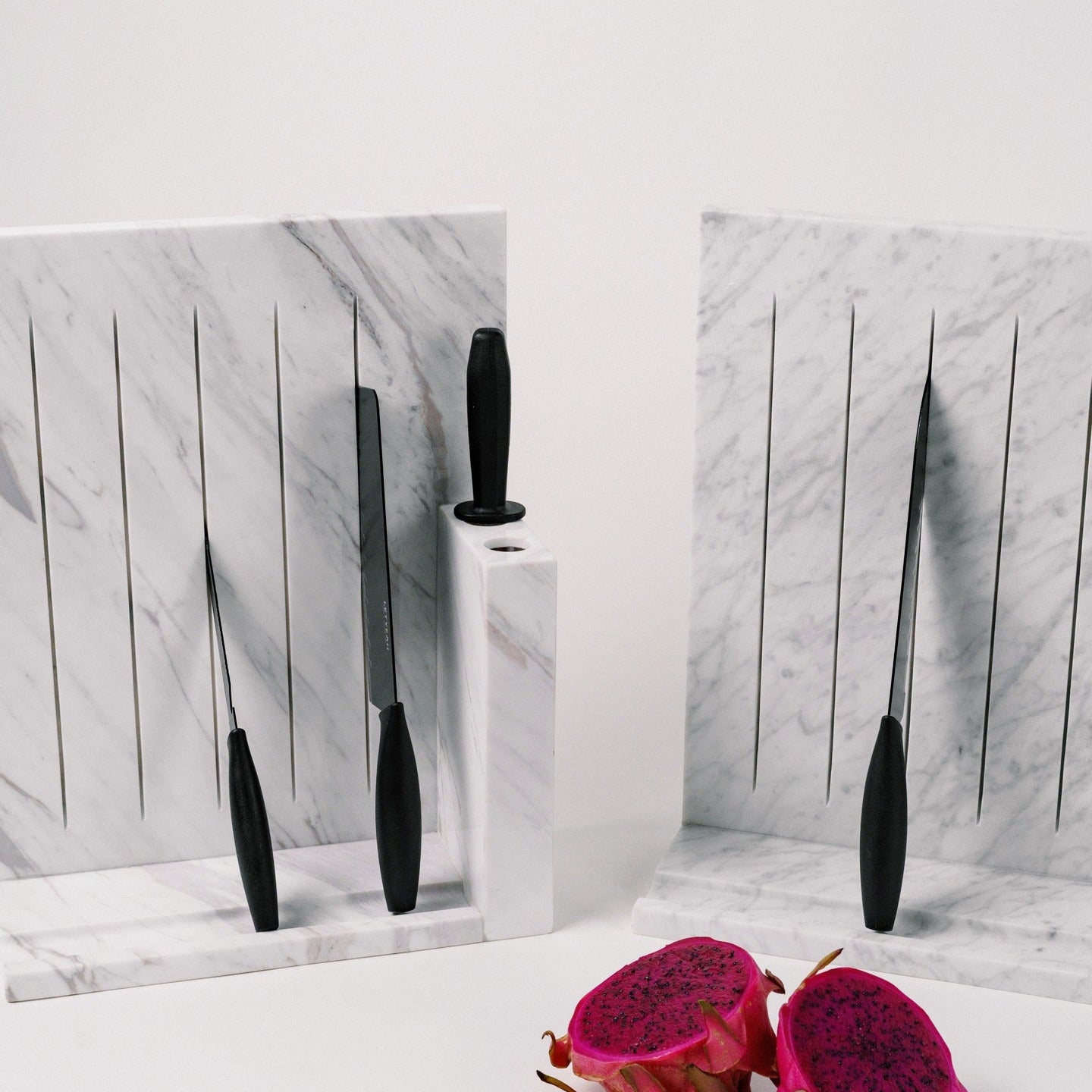The Stand Bloc Knife Holder features a spacious, upright design that securely holds your knives while preventing blade dullness by resting them against a sleek marble wall.