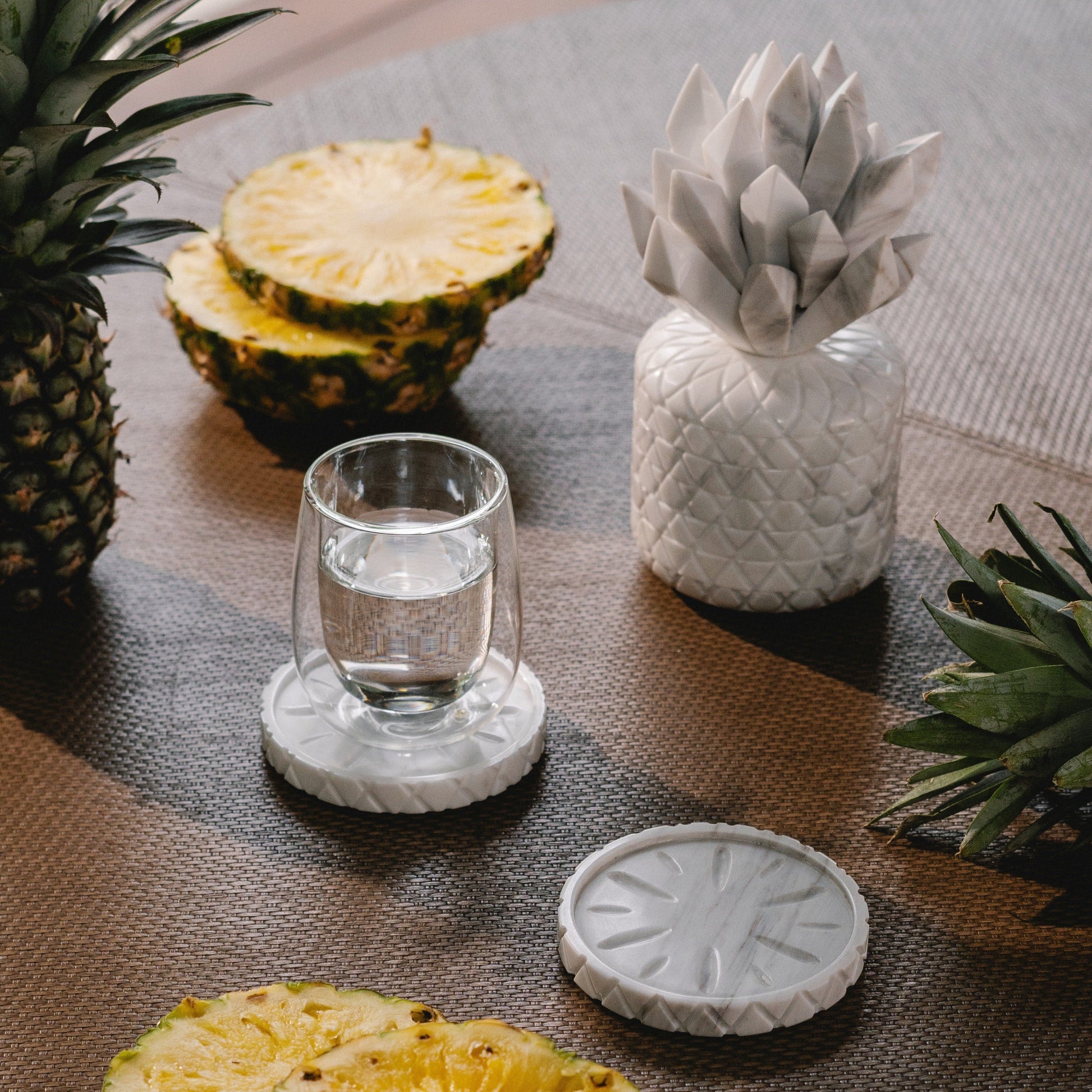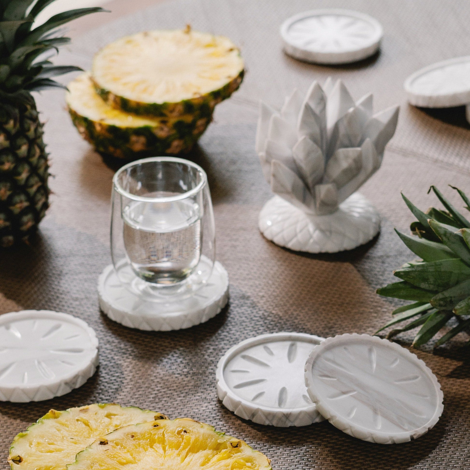 This marble pineapple is sliced into seven rounded coaster segments. At the top, there is a crown of pineapple leaves that is designed to make it look like one, making it excellent as a decoration or show when serving your fresh drink. With its solid and thick marble substance, it keeps various types of drinks from spilling or leaving markings on the table. The pina coaster is intricately designed to appear like the inside of a pineapple.