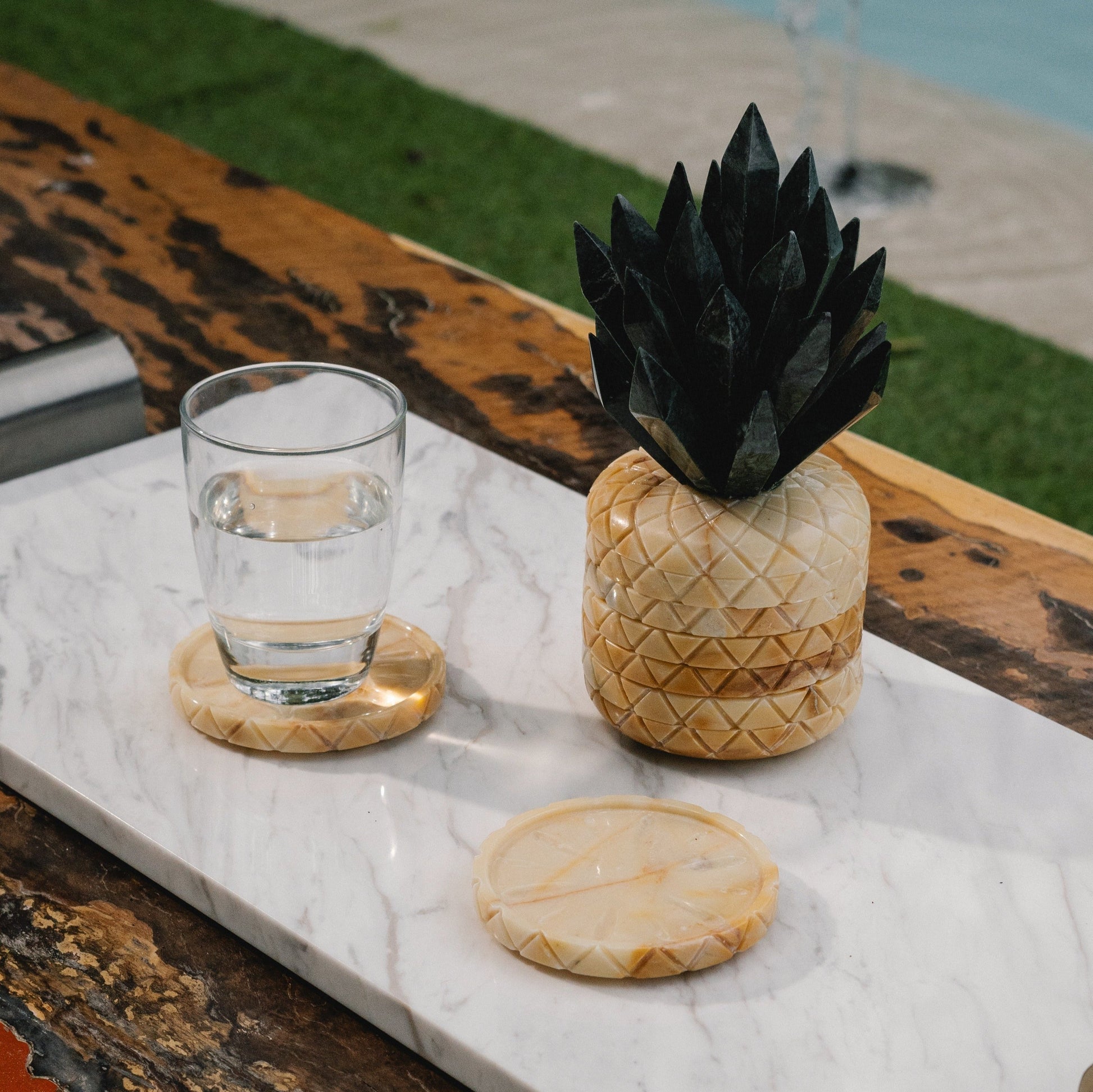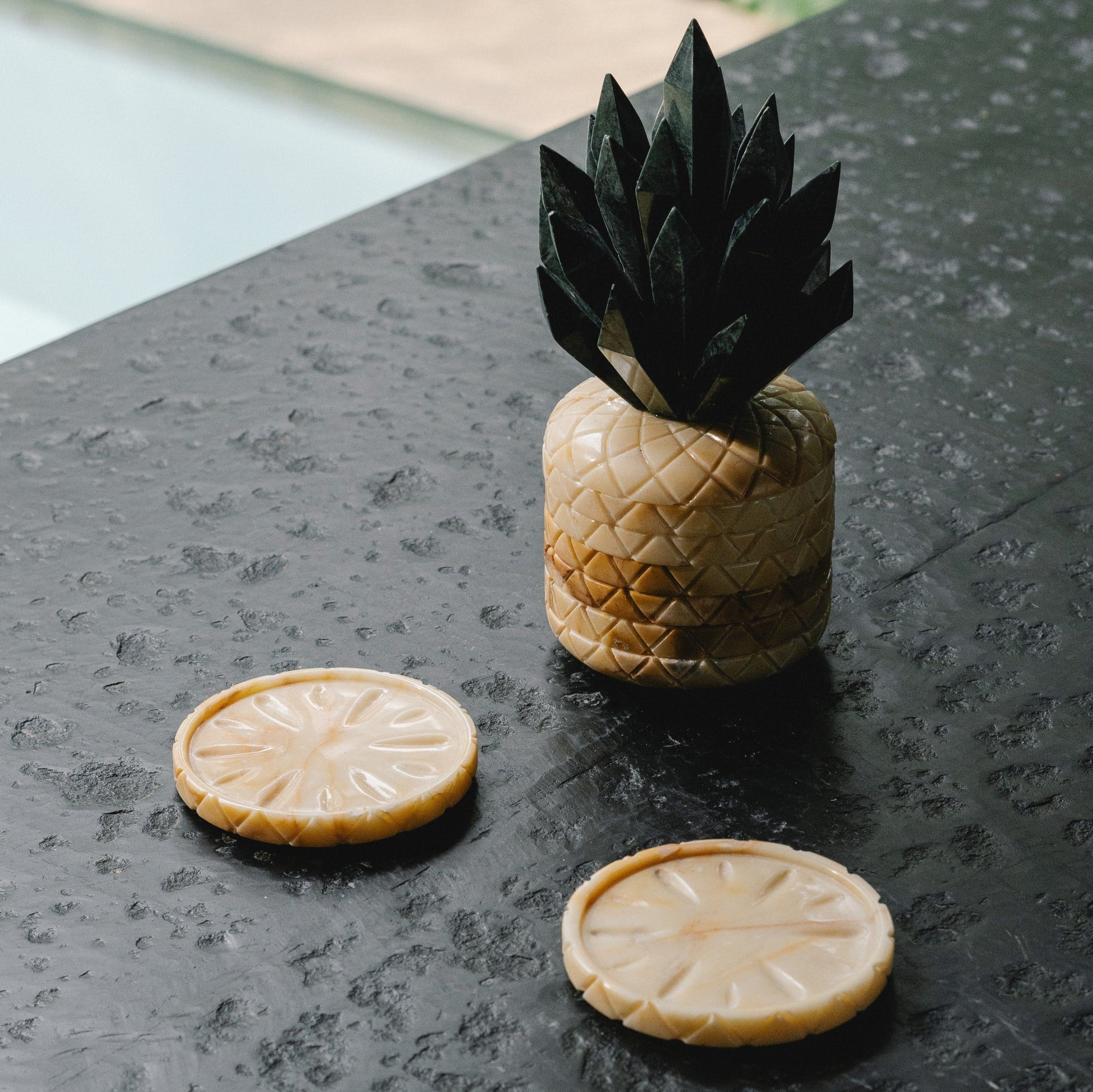 This onyx pineapple is sliced into seven rounded coaster segments. At the top, there is a crown of pineapple leaves that is designed to make it look like one, making it excellent as a decoration or show when serving your fresh drink. With its solid and thick material substance, it keeps various types of drinks from spilling or leaving markings on the table. The pina onyx coaster is intricately designed to appear like the inside of a pineapple.