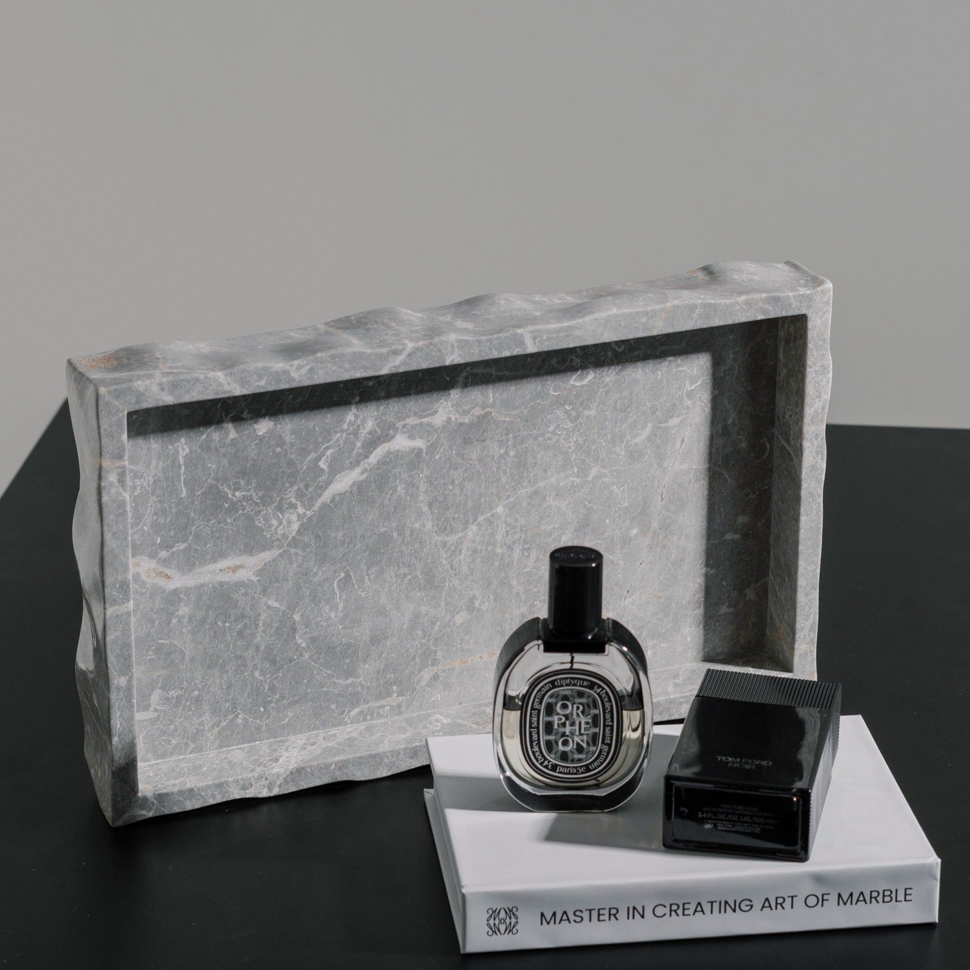 The undulating waves on the surface of the tray create a visual masterpiece, showcasing the natural beauty of the marble. The smooth and polished finish enhances the luxurious appeal of the tray, making it a versatile piece for serving beverages, appetizers, or simply as a stunning decorative accent.